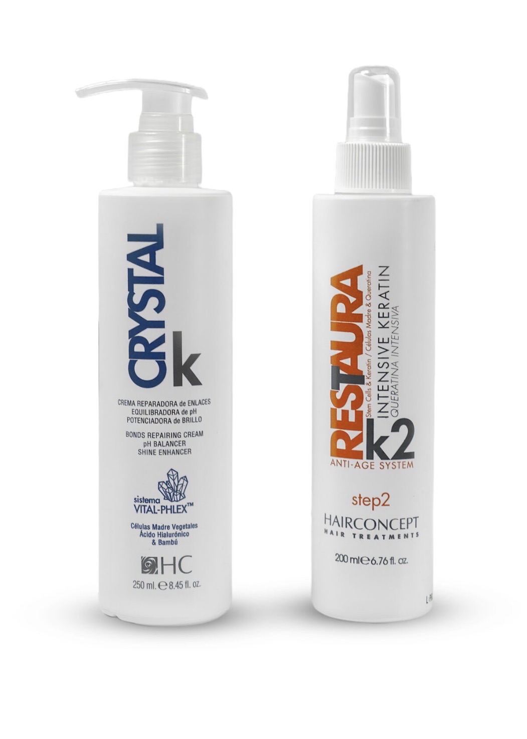 Profesionální sada pro hlubokou regeneraci a obnovu poškozených vlasů po barvení, odbarvování či chemických procedurách. Obsahuje keratinový krém Crystal K pro obnovu vazeb a ochranu barvy a intenzivní lotion Restaura K2 pro rekonstrukci vlasů a roztřepených konečků.